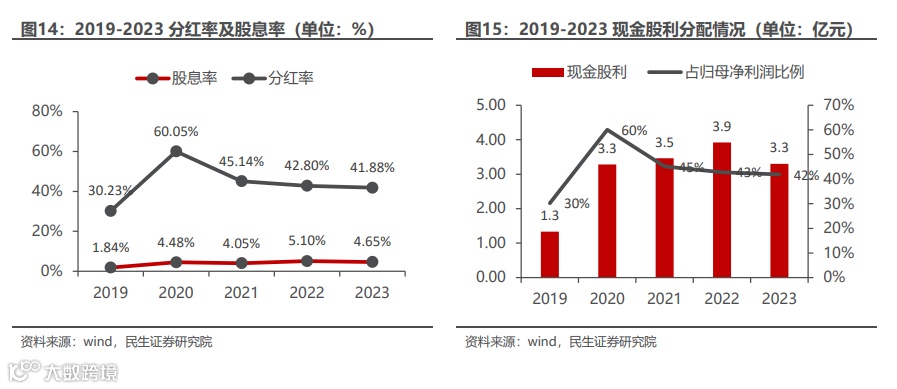 分红率及股息率整体向上,现金股利逐年提高。公司注重与投资者共享发展成果,分红率和股息率由2019年30.23%/1.84%提升至2023年41.88%/4.65%。公司制定并执行持续、稳定的高比例现金分红政策,2020年分派现金股利同比增长146.08%达到3.28亿元,占当年归母净利润的60.05%;2021年公司发布《公司2021-2023年度股东回报规划》,承诺每年以现金方式分配的利润不少于当年归母净利润的40%,2021/2022/2023年实际现金分红比例为45.14%/42.80%/41.88%,充分与股东分享公司高质量发展的红利。