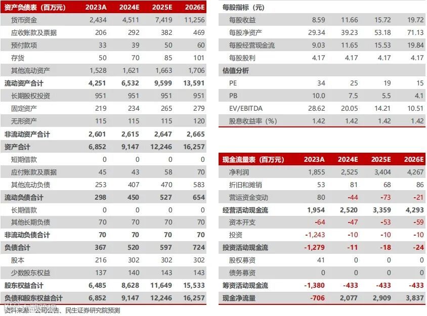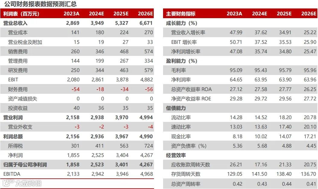 盈利能力较为稳定,费率控制良好。①毛利率端,24Q1,毛利率为94.55%,同比-0.75 pct,毛利率较为稳定,未来随再生材料濡白天使与如生天使收入快速增长,有望继续拉动公司整体毛利率上行。②费率端,24Q1,销售费率、管理费率、研发费率、财务费率为8.34%、4.07%、7.13%、-1.69%,分别同比-2.07、-3.92、+0.21、+0.80 pct。其中,管理费用同比-34.57%,主要系23年同期包含港股上市费用,金额较大。随着公司加大销售费用管控、优化管理效率,收入保持快速增长趋势下,我们预计销售费率与管理费率有望继续摊薄;同时公司高度重视研发投入,预计研发费率将维持在稳定区间。结合毛利率与费率情况,24Q1,净利率为65.35%,同比-0.19 pct。