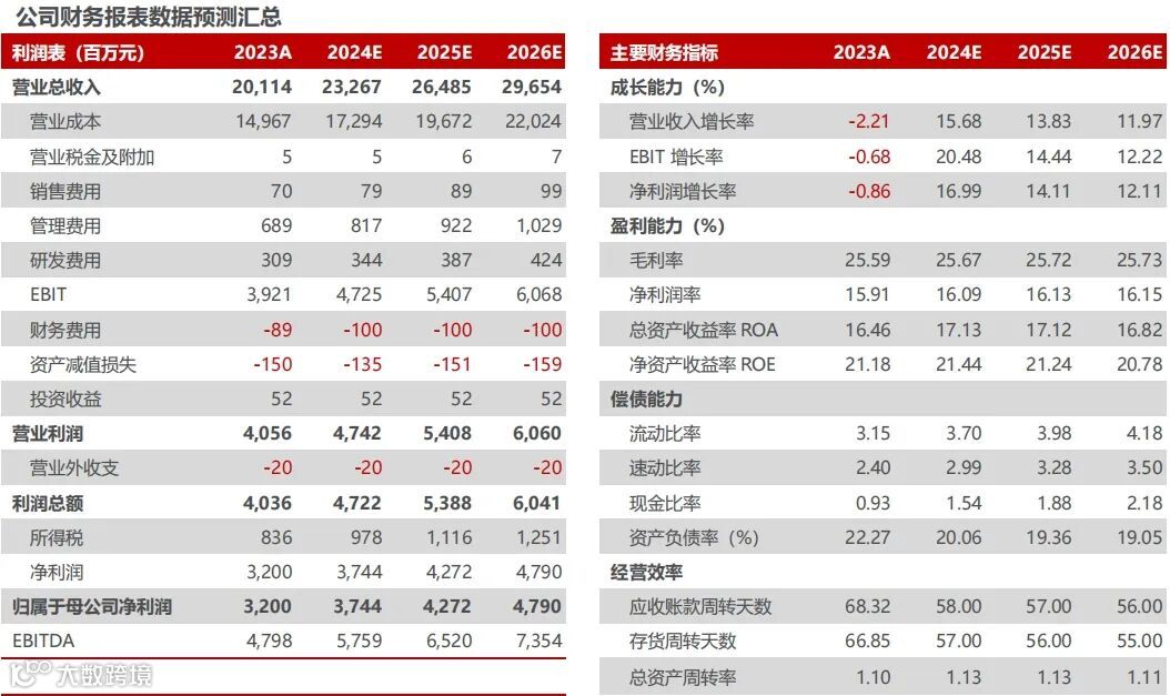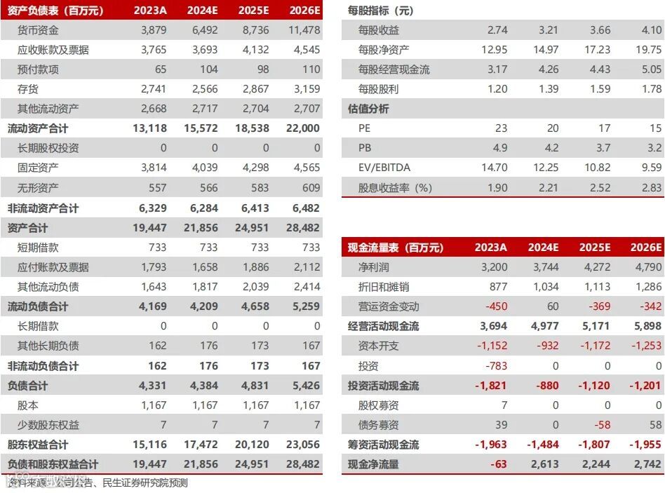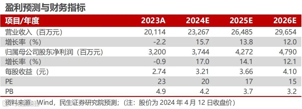 投资建议:预计2024-2026年公司实现营业收入232.67、264.85、296.54亿元,分别同比+15.7%、+13.8%、+12.0%;归母净利润分别为37.44、42.72与47.90亿元,同比+17.0%、+14.1%与+12.1%,对应PE为20/17/15倍,维持“推荐“评级。