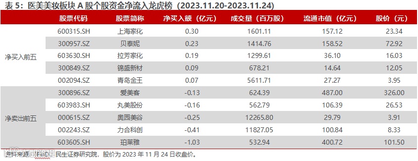 医美美妆净买入前五:上海家化(0.30亿元)、贝泰妮(0.23亿元)、拉芳家化(0.19亿元)、锦盛新材(0.09亿元)、青岛金王(0.07亿元);