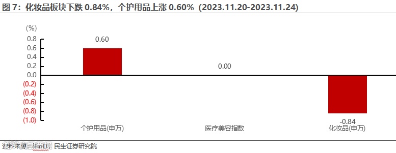 本周美容护理各细分板块:医疗美容板块周涨跌幅为0.00%,个护用品板块上涨0.60%,化妆品板块下跌0.84%。