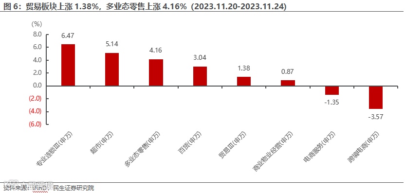 本周商贸零售各细分板块:超市板块上涨5.14%,专业连锁板块上涨6.47%,百货板块上涨3.04%,跨境电商板块下跌3.57%,商业物业经营板块上涨0.87%,贸易板块上涨1.38%,电商服务板块下跌1.35%,多业态零售板块上涨4.16%。