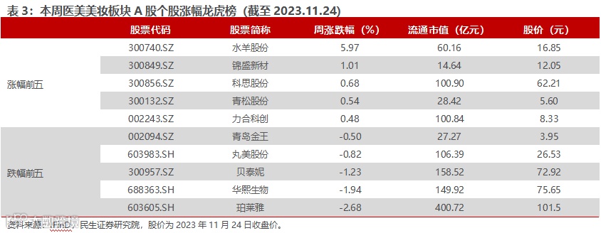 医美美妆跌幅前五:珀莱雅(-2.68%)、华熙生物(-1.94%)、贝泰妮(-1.23%)、丸美股份(-0.82%)、青岛金王(-0.50%)。