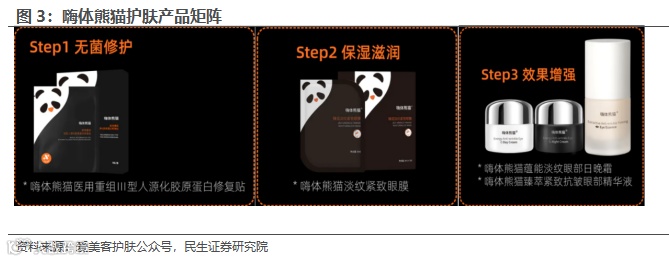 嗨体熊猫护肤系列:专为医美眼部抗皱顾客研制。嗨体熊猫护肤与嗨体熊猫针配套的眼部护理套装,沿用独有嗨体4D成分,以期通过医美及护肤搭配实现1+1>2的效果,目前已上线在售产品包括熊猫小黑瓶、熊猫小白瓶、肽级眼精华,另有淡纹紧致眼膜、医用重组III型人源化胶原蛋白修复贴两款产品待售。