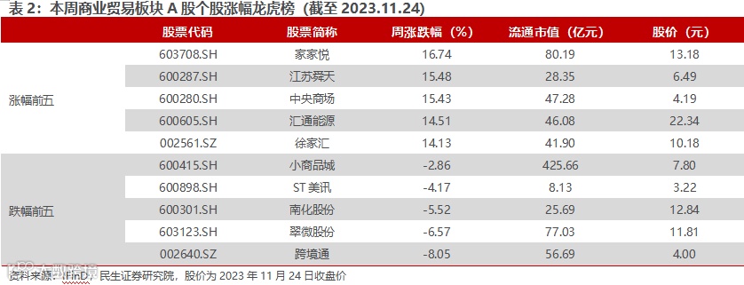 商业贸易涨幅前五:家家悦(16.74%)、江苏舜天(15.48%)、中央商场(15.43%)、汇通能源(14.51%)、徐家汇(14.13%);