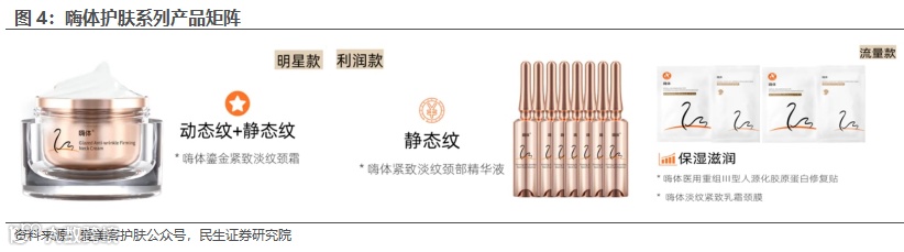 嗨体护肤系列:与嗨体同根同源的颈部护理套装。嗨体护肤和嗨体针剂配套的颈部护理套装,同样延续嗨体经典4D成分,打造嗨体1+3一站式护肤,匹配及延伸嗨体治疗效果,实现动静纹双抗,目前嗨体紧致淡纹颈部精华液、嗨体鎏金紧致淡纹颈霜、嗨体医用重组III型人源化胶原蛋白修复贴及嗨体淡纹紧致乳霜颈膜3款产品均处待售状态。