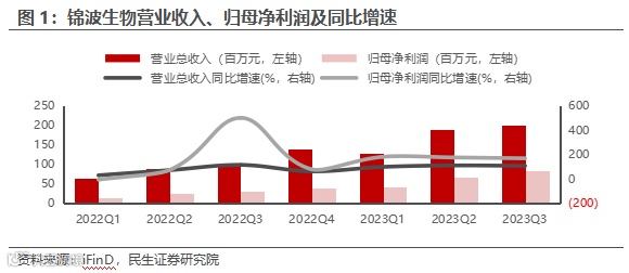 北交所重组胶原蛋白第一股,薇旖美具备行业领先优势。公司成立于2008年,是国内领先、具有代表性的重组胶原蛋白企业,已取得一系列突破性成果。包括发现人Ⅲ型胶原蛋白特殊的功能区域,成功解析人Ⅲ型胶原蛋白核心功能区的原子结构,具有特殊的164.88°三螺旋结构;利用合成生物的制造方式,实现具有三螺旋结构的A型重组Ⅲ型人源化胶原蛋白的大规模生产。得益于技术上的突破,2021年6月29日,锦波生物的注射级“重组III型人源化胶原蛋白冻干纤维”获国家药监局批准上市,是中国国内第一款获得III类医疗器械(注射级)资质的重组人源化胶原蛋白。在2023年8月28日, “注射用重组Ⅲ型人源化胶原蛋白溶液”获批上市。1-3Q23,锦波生物实现营业收入5.17亿元,同比+105.64%;归母净利润为1.92亿元,同比+173.75%。重组III型人源化胶原蛋白冻干纤维与重组Ⅲ型人源化胶原蛋白凝胶带动收入快速增长。