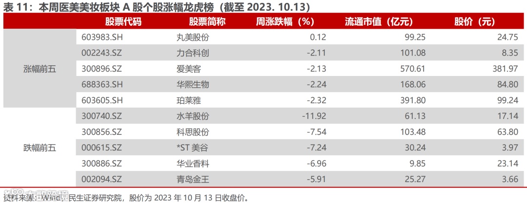 医美美妆跌幅前五:水羊股份(-11.92%)、科思股份(-7.54%)、*ST美谷(-7.24%)、华业香料(-6.96%)、青岛金王(-5.91%)。