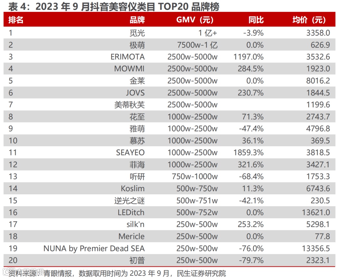 9月抖音美容仪类目:GMV超6亿元,同比增长33.15%。TOP20品牌的GMV占美容仪类目的88.18%;TOP3品牌销量最高的单品分别为:觅光胶原炮、极萌大熨斗、Erimota复合牛奶光美容仪;TOP20的品牌中35%为国产品牌,上榜的国产品牌GMV占TOP20品牌总GMV的53.18%。