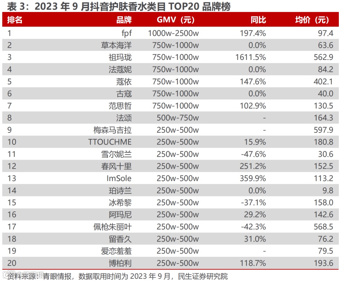 9月抖音香水类目:GMV超2亿元,同比增长33.05%。TOP20品牌的GMV占香水类目的45.17%;TOP3品牌销量最高的单品分别为:FPF调香师香水、草本海洋固体香膏、祖玛珑英国橡树与榛子香水;TOP20的品牌中60%为国产品牌,上榜的国产品牌GMV占TOP20品牌总GMV的64.74%。