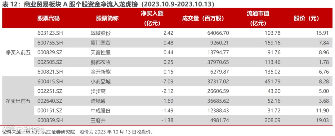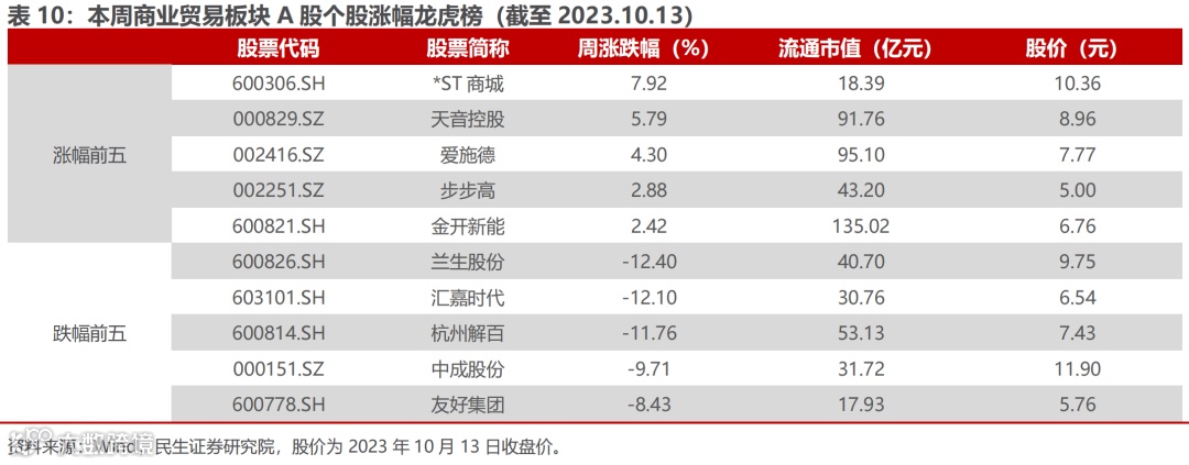 商业贸易跌幅前五:兰生股份(-12.4%)、汇嘉时代(-12.1%)、杭州解百(-11.76%)、中成股份(-9.71%)、友好集团(-8.43%)。