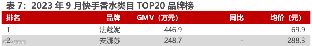 快手香水类目:9月GMV为2812万元,同比增长23.25%。TOP20品牌的GMV占香水类目的72.67%;TOP3品牌销量最高的单品分别为:法蔻尼调香师香水、安娜苏绮幻飞行淡香水、范思哲臻挚粉钻女士香水;TOP20的品牌中75%为国产品牌,上榜的国产品牌GMV占TOP20品牌总GMV的80.71%。