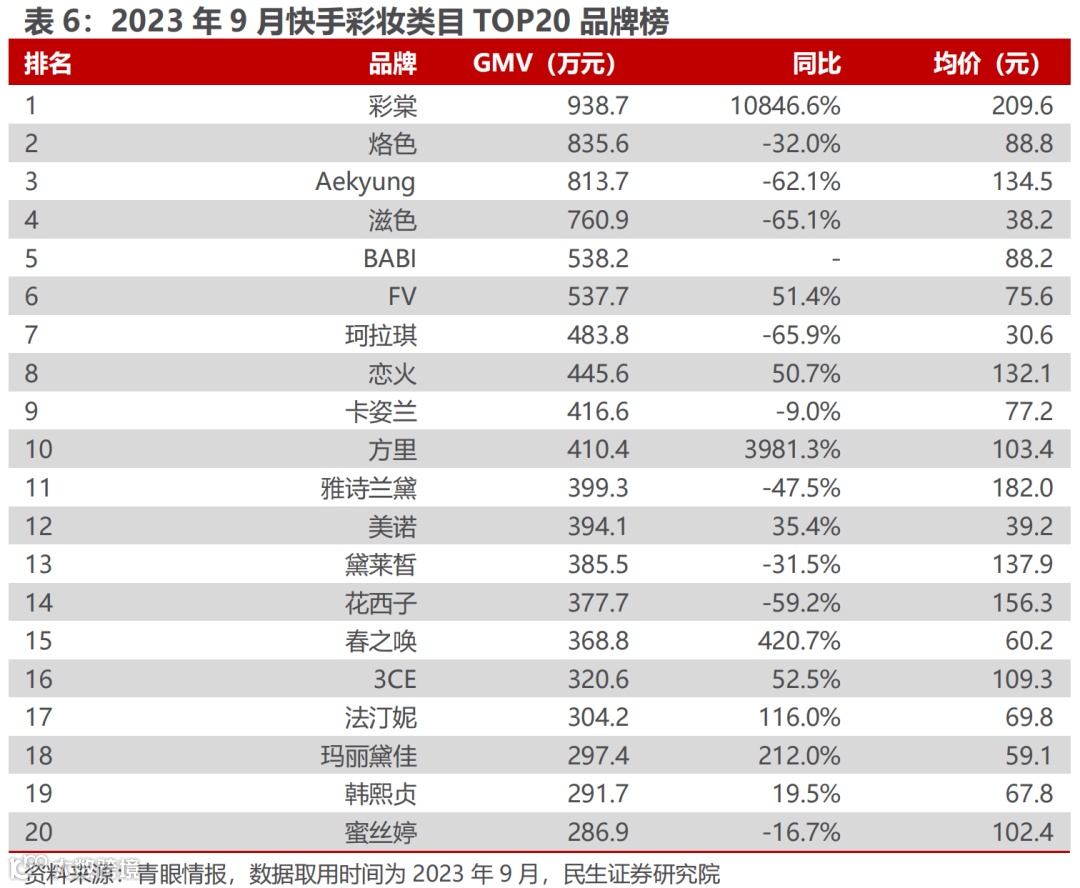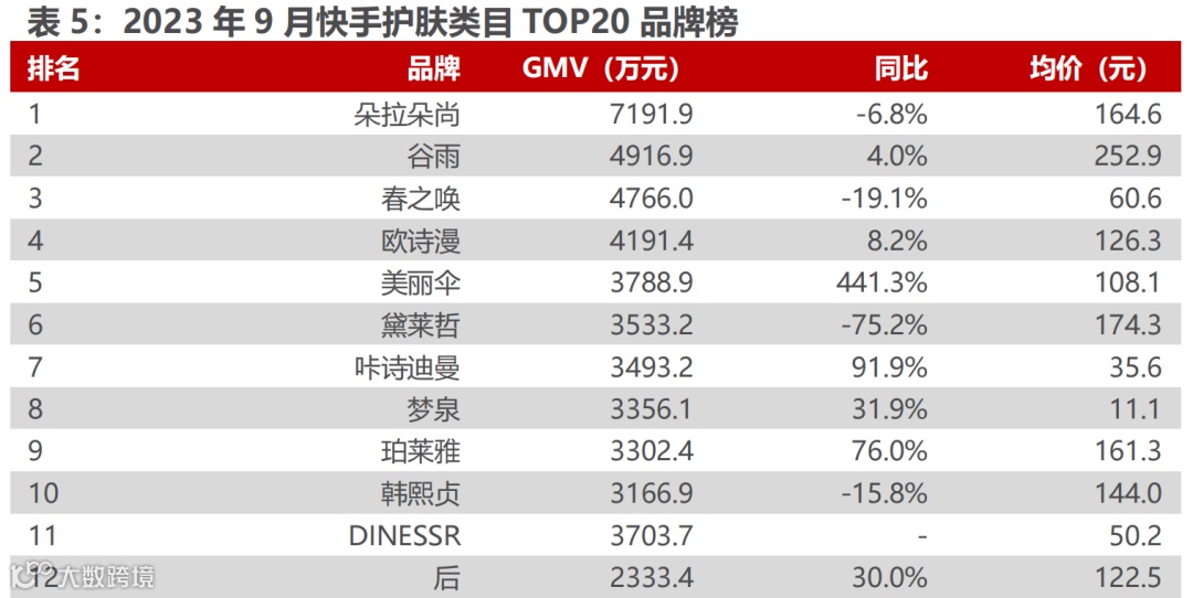 快手护肤类目:9月GMV为16.93亿元,同比下滑12.49%。TOP20品牌的GMV占护肤类目的36.03%;TOP3品牌销量最高的单品分别为:朵拉朵尚红鱼子臻颜紧致套装、谷雨雪肌水乳套装、春之唤轻奢定制套盒;TOP20的品牌中95%为国产品牌,上榜的国产品牌GMV占TOP20品牌总GMV的96.18%。