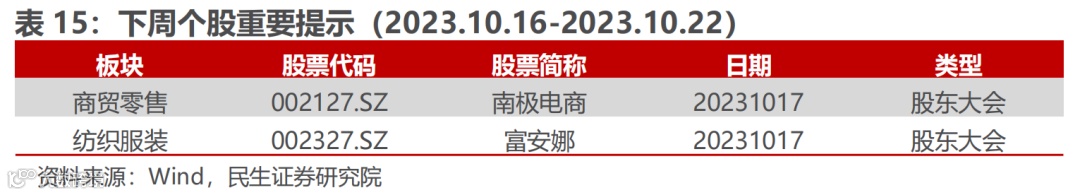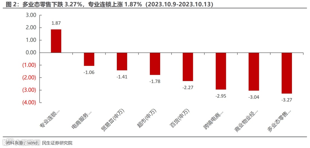 本周商贸零售各细分板块:超市板块下跌1.78%,专业连锁板块上涨1.87 %,百货板块下跌2.27%,跨境电商板块下跌2.95%,商业物业经营板块下跌3.04%,贸易板块下跌1.41%,电商服务板块下跌1.06%,多业态零售板块下跌3.27%。