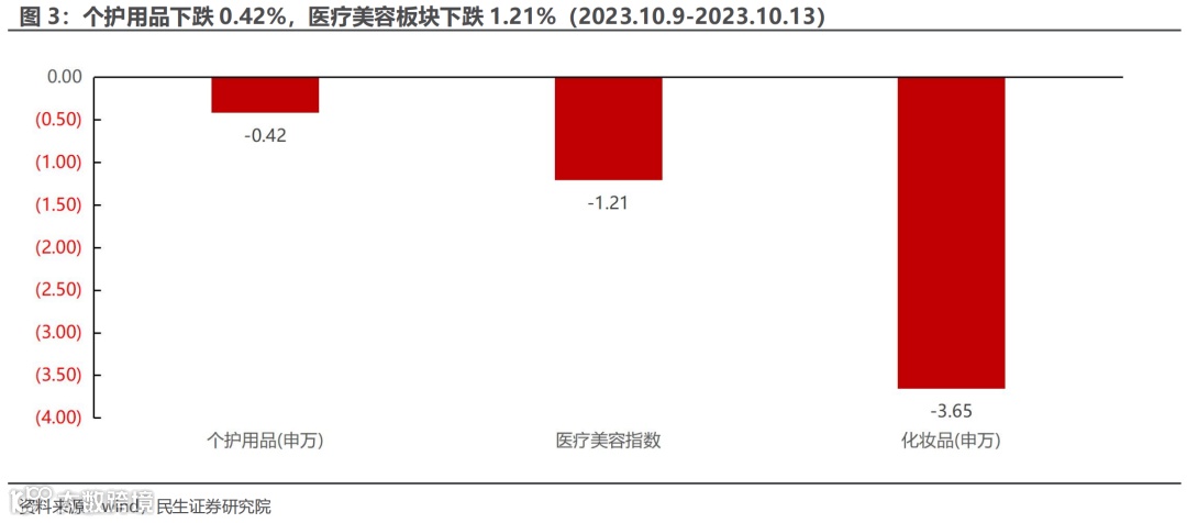 本周美容护理各细分板块:化妆品板块下跌3.65%,医疗美容板块下跌1.21%,个护用品板块下跌0.42%。
