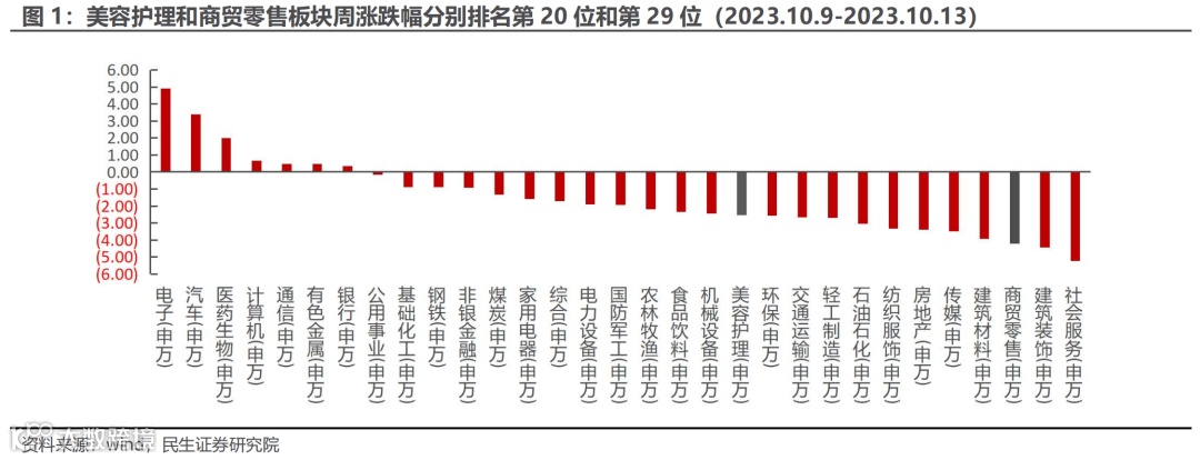 本周31个申万一级行业:美容护理板块(-2.52%)和商贸零售板块(-4.22%)在31个申万一级行业中分别排名第20位和第29位。本周涨幅最大的板块是电子(4.90%),跌幅最大的板块为社会服务(-5.23%)。