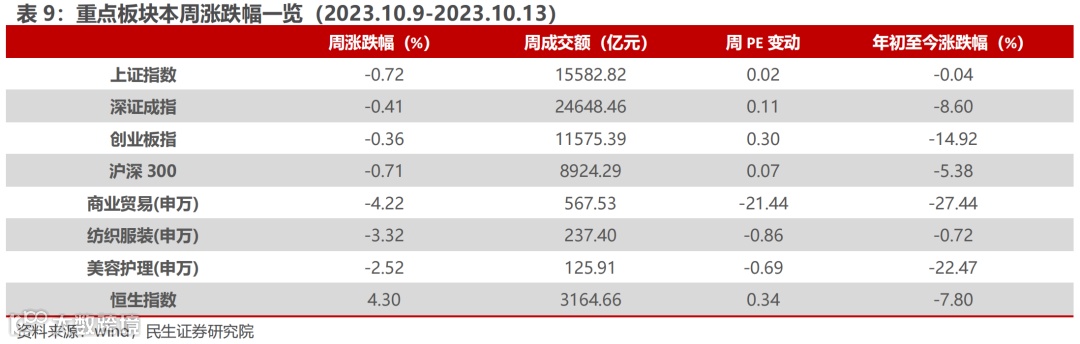 本周各主要指数:上证指数下跌0.72%,深证成指下跌0.41%,创业板指下跌0.36%,沪深300下跌0.71%,商业贸易板块下跌4.22%,纺织服装板块下跌3.32%,美容护理板块下跌2.52%,恒生指数上涨4.30%。