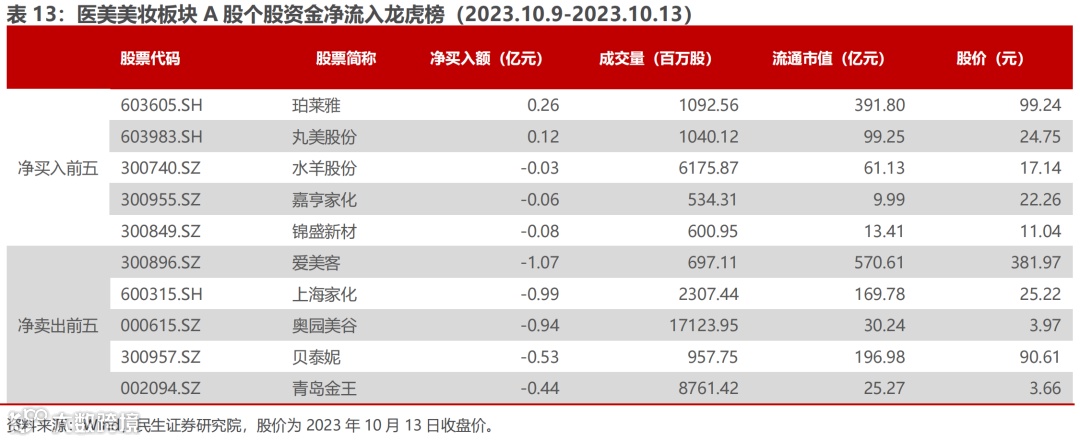 医美美妆净买入前五:珀莱雅(0.26亿元)、丸美股份(0.12亿元)、水羊股份(-0.03亿元)、嘉亨家化(-0.06亿元)、锦盛新材(-0.08亿元);