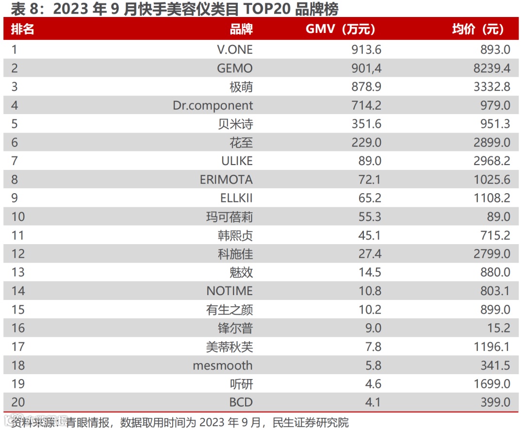 快手美容仪类目:9月GMV为5603.4万元,同比+6165.47%。TOP20品牌的GMV占美容仪类目的36.47%;TOP3品牌销量最高的单品分别为:V.ONE新款三维立体美容面罩、金莱瑞士奢华美容仪G20、极萌胶原炮美容仪;TOP20品牌中90%为国产品牌,上榜的国产品牌GMV占TOP20品牌总GMV的81.07%。