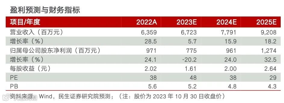 我们预计23-25年归母净利润为7.75/9.61/12.74亿元,同比增速-20.2%/+24.0%/+32.5%,当前股价对应23-25年PE分别为48x、38x、29x,维持“推荐”评级。
