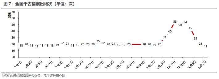 宋城演艺:假期八天,宋城演艺全国千古情演出场次共338场,是2022年国庆黄金周的384.10%、2019年国庆黄金周的125.19%;千古情单日最高上演59场,各大千古情霸屏各大榜单。(注:下表统计场次为宋城演艺公众号公布的千古情计划演出场次,由于千古情演出可能视当天演出情况临时加场,因此下表统计的计划演出场次数与公司统计的实际演出场次存在一定差距)