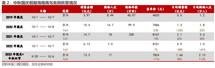 离岛免税表现:根据海口海关数据,9月29日至10月6日,海口海关共监管离岛免税销售金额13.3亿元,免税购物人数17万人次。双节整体,离岛免税日均销售1.66亿元,日均购物人次2.13万人次,客单价7824元/人,同比2021年各-21%/-17%/-4%,同比2022年各+90%/+113%/-11%。