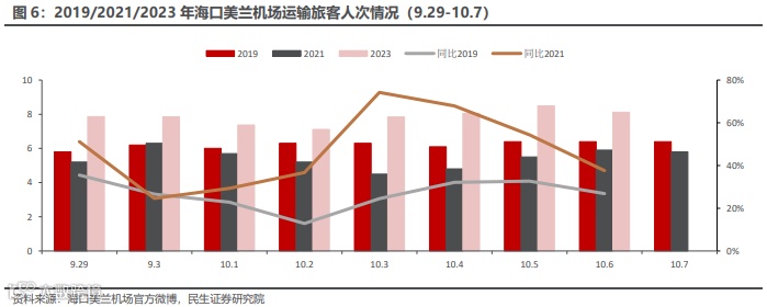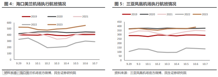 海南航班情况:2023年国庆+中秋双节期间(9.29-10.6)美兰机场运输人次前八天合计达62.7万人次,同比2019和2021年增长26.67%/45.48%。2023年国庆+中秋双节期间(9.29-10.6)美兰机场前八天执行航班数合计达4096架次,同比2019/2020/2021/2022年增长28.16%/16.07%/30.24%/92.48%。2023年国庆+中秋双节期间(9.29-10.6)凤凰机场前八天执行航班数合计达2948架次,同比2019/2020/2021/2022年变化27.07%/-1.14%/12.86%/217.33%。