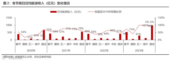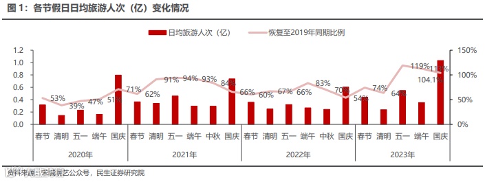 根据文旅部10月7日披露数据,2023年中秋节、国庆节假期,全国国内旅游出游人数8.26亿人次,同比增长71.3%,恢复至19年104.1%;实现国内旅游收入7534.3亿元,同比增长129.5%,恢复至19年101.5%。