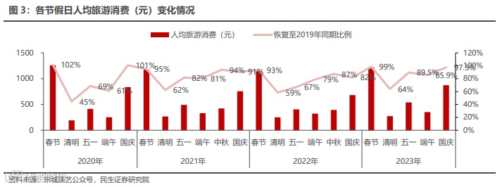 从文旅部10月7日披露数据来看,相较19年,23年中秋国庆旅游人次/旅游收入均增,但因旅游人次增幅大于旅游收入增幅,人均消费低于19年同期水平,约为19年同期97.5%(人均消费=旅游收入/旅游人次),表现与端午、五一数据走势一致。