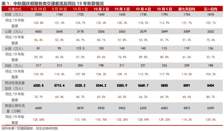 综合来看,我们认为国庆假期客流总体修复情况或与五一接近:其中营业性客运中铁路/水路/民航恢复情况略超过19年同期;公路客运人次指的是“公路运输企业及由其组织的其他单位在一定时期内实际运送的旅客人数”,即“客运站大巴车运输的旅客数”;与疫情前对比,铁路、自驾对大巴车出行形成明显替代;与五一对比,国庆假期长线游占比更高,因此公路客流恢复度较五一更低。从高速公路车流量来看,国庆假期实际公路出游情况恢复度与五一接近。