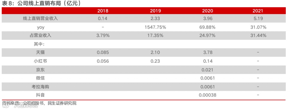 此外,公司加强线上多平台布局,把握多样化线上渠道增长红利。在原有天猫旗舰店的基础上,公司陆续在天猫、小红书、考拉海购、京东、抖音、快手、拼多多等B2C 平台设立官方自营旗舰店,实现线上销售平台的全覆盖。未来公司将继续以天猫为基础,借助京东平台寻求线上第二增长渠道,同时深入小红书、微博等兴趣社交平台与达人合作,多方面打造个性内容 化方案来吸引新客户,借助平台自营模式的流量优势,形成线上直销与代销的互补融合。