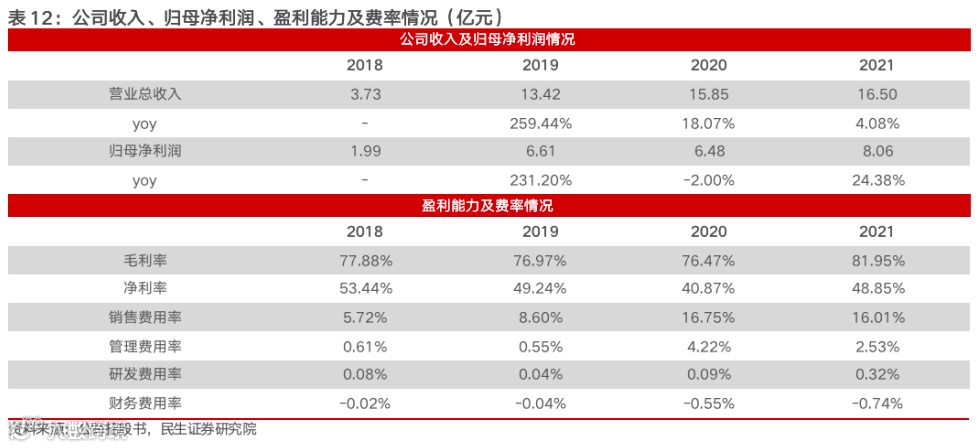 公司营业收入自2018年整体呈稳定增长趋势。2018/2019/2020/2021 年营收分别为3.73/13.42/15.85/16.50 亿元,其中2019 年营收同比增长259.44%,2020 年/2021年同比增速分别为18.07%/4.08%。2018/2019/2020年公司归母净利润分别为 2.00/6.61/6.48 亿元,2019年归母净利润同比增长 231.20%,2020年/2021年同比增速分别为-2%/24.38%。2019年收入及业绩呈现快速增长主要系行业持续利好,市场需求较旺盛,公司线下经销商扩充迅速,逐步形成了覆盖医疗机构、美容机构、连锁零售药店等多元化终端销售矩阵,同时公司发力营销,增强了品牌知名度;2020年收入及业绩增速放缓主要系械字号产品的使用场景经营活动因新冠肺炎疫情受到一定程度影响,减少采买该类产品所致。