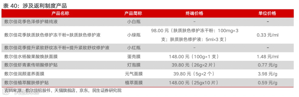 2)分销联盟系统平台经销商:1、经销商通过微信公众号的分销联盟系统平台便可完成注册、认证管理及销售全部环节。该平台主要面向以自然人为主的丙类经销商,规模较小但具有私域流量资源,通过对其制定严格的业绩淘汰制度,以保证经销商的销售竞争力。2、在联盟经销模式下,公司推出该渠道的特色产品,如敷尔佳虾青素传明酸修护贴、敷尔佳水杨酸果酸焕肤面膜等,此类产品不在分级经销渠道销售,从而有效避免了价格竞争。3、公司在经销协议中明确约定了针对分销联盟系统平台的经销商奖励条款,根据业绩完成程度之高低,公司对完成指标、超额指标的经销商进行返利奖励(3%-30%),对未完成指标的经销商,采用取消经销资格等惩罚措施,奖惩与业绩高度绑定,管理制度直接有效。