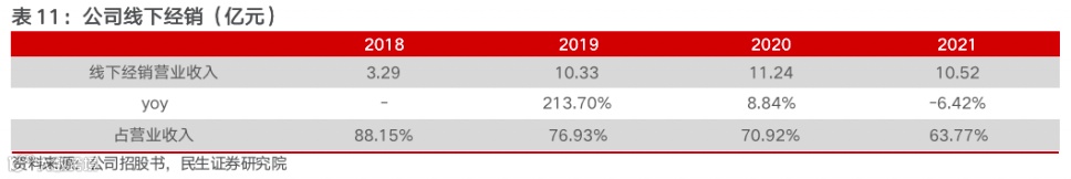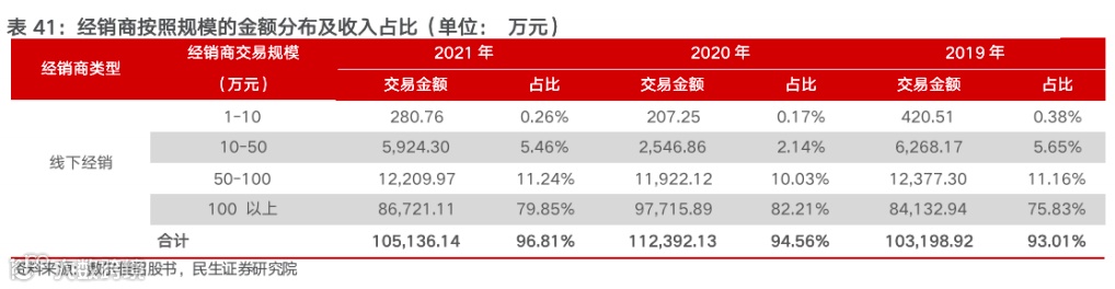 严格管理下,公司经销商实力强劲,大多经销商收入体量超过百万元。在公司的严格管理下,部分经销商因业绩考核不达标被淘汰,2019-2020年整体经销收入占比为 18.67%/17.48%,但公司也在加大力度和新经销商合作,当前已形成稳定收入贡献。从经销商收入规模结构看,公司的强管理机制造就了经销商的实力,收入规模体量大多在百万元以上,2019年至2021年年交易金额在 100万元以上的线下经销商贡献的收入比重为:75.83%/82.21%/79.85%。