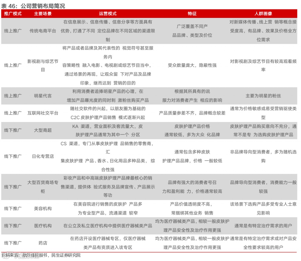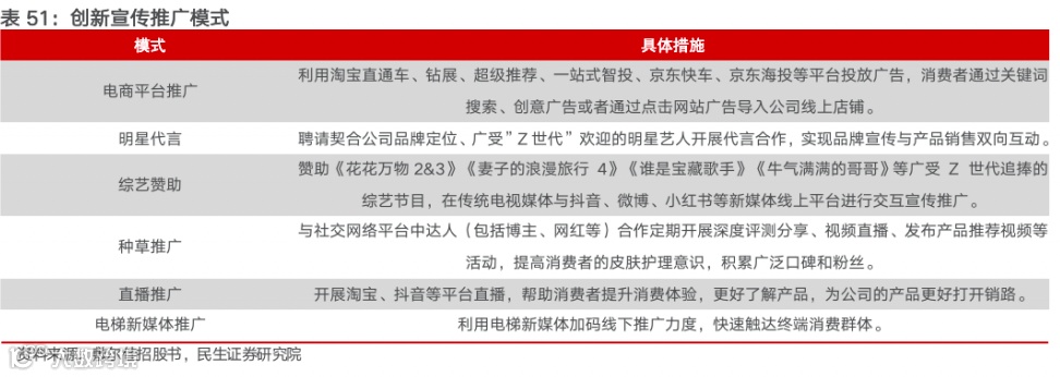 公司从传统媒体、新媒体、移动端、公众号到小程序等多层次推广矩阵,实现从广度到精度的品牌推广。公司根据市场形势的变化持续进行销售推广模式的创新,早期阶段抓住高性价比的社交营销红利期,奠定良好的口碑基础。1)公司重视对消费者的教育,通过与具有公信力的 KOL 进行深度合作,以线上直播、短视频等形式密集输出专业护肤知识,传递正确的护肤理念,提高消费者的皮肤护理意识。2)公司运营团队具有敏锐的市场热点捕捉能力,通过聘请个人形象与品牌定位高度契合的明星代言人,培养与消费者沟通的焦点人物,实现品牌宣传与产品销售相结合的双向互动。3)线上方面,公司充分利用新媒体时代的营销渠 道多元化趋势,通过赞助综艺节目、与直播达人合作,在传统电视媒体与抖音、微博、小红书等新媒体线上平台进行交互宣传推广,树立专业的品牌形象、拓宽 用户群体。4)线下方面,公司积极参加各地的美容博览会,寻求与更优质的经销商及客户合作;并进行电梯媒体投放,快速便捷触达终端消费群体,从而进一步拓 展品牌影响力及知名度。
