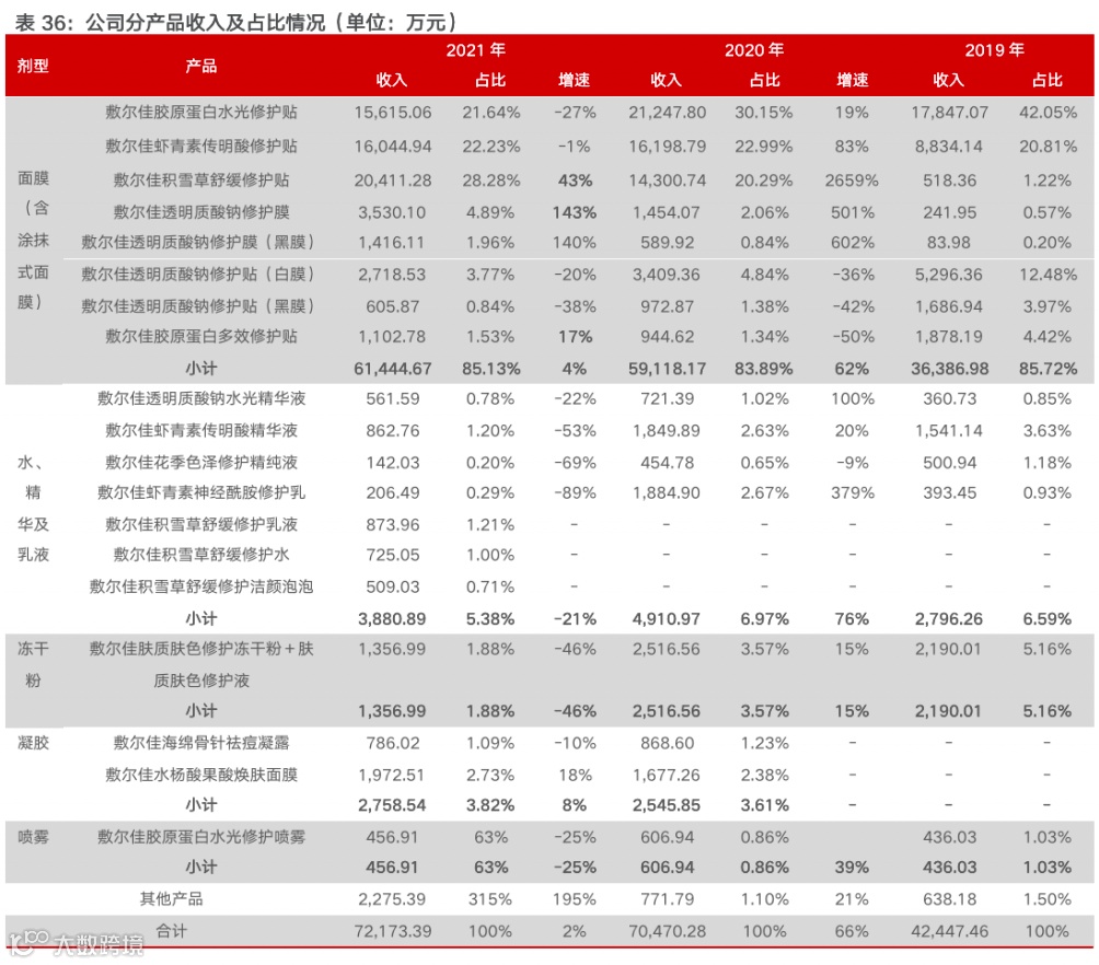 基于大单品奠定的品牌力推动,多样化产品矩阵呈现持续放量。敷尔佳面膜(含涂抹式面膜)、凝胶等剂型产品均呈现快速增长: 2021年敷尔佳积雪草舒缓修护贴收入为2.04亿元,同比增长43%;敷尔佳透明质酸钠修护膜收入为0.35亿元,同比增长143%;敷尔佳胶原蛋白多效修护贴收入为0.11亿元,同比增长17%。得益于黑/白膜两大单品在消费者端累积的品牌影响力,使得公司品牌营销得以实现更高转化率,驱动旗下其他产品得到消费者认可并实现快速放量。