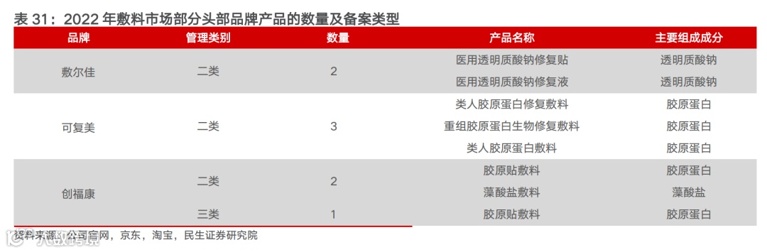 从产品原料维度看,敷料市场的分布主要分为透明质酸类敷料企业和胶原蛋白类敷料企业。透明质酸类敷料企业主要为敷尔佳、可孚、荣晟等品牌、胶原蛋白类敷料企业则为创福康、可复美等品牌,但创福康主打动物源胶原蛋白、而可复美主打重组胶原蛋白。但从产品管理类别看,当前产品以二类证居多。