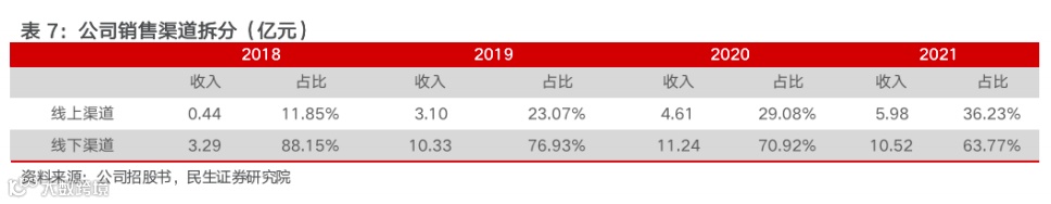 渠道角度,销售渠道以线下为主,线上为辅模式。从收入组成看,公司线下收入占比过半,但线上占比呈现持续提升。其中,2021年公司线下渠道销售产品收入为10.5亿元,占总营收的63.77%;线上渠道销售产品收入为5.98亿元,占总营收的36.23%。