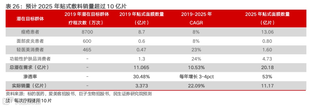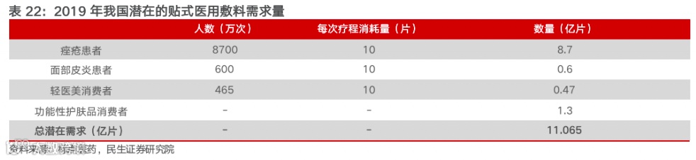 贴式医用敷料大多主打修复类功能,用户大致可分为三类:一类为具有痤疮、皮炎等皮肤问题的患者,一类为接受轻医美手术后急需皮肤修复的医美人群,一类为追求功能性护肤的消费者。据标点医药,2019年三类人群潜在的贴式医用敷料需求量达到11.065亿片,实际需求量为3.37亿片,渗透率仅30%,尚存在较大可提升空间。