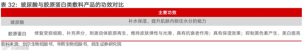原料端:消费者呈现需求多样化,而非单一聚焦补水,胶原蛋白更符合消费需求下的发展趋势。对于痤疮、皮炎等皮肤问题的患者对于祛痘美白的需求日益增长;轻医美流行后,术后人群急需具有保湿、修复效果的皮肤护理产品;追求功效性护肤的消费者则愈发注重各类活性成分在解决肌肤问题上的高效性。相比于玻尿酸相对单一的补水功效,胶原蛋白具有修复保湿、美白抗衰、润滑肌肤等多重功效,其中重组胶原蛋白的功效性表现突出,而其自身的低致敏性和更易量产能力,有望满足消费者日益增长的皮肤护理和修护需求。