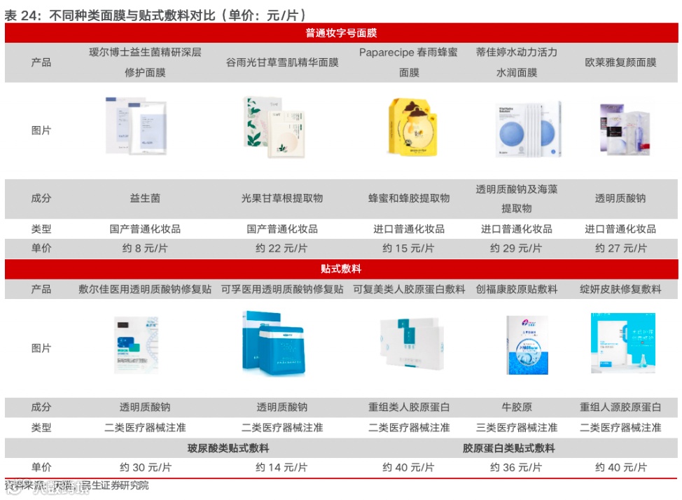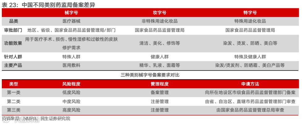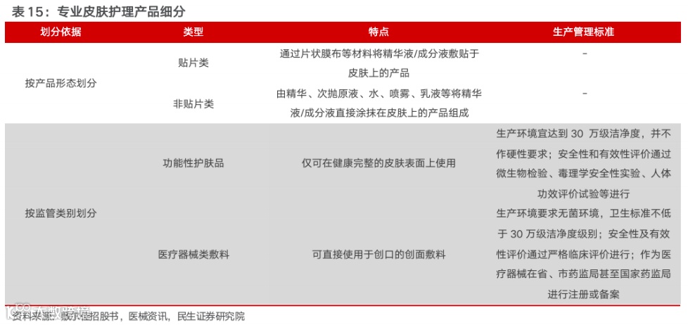 专业皮肤市场根据产品形态及监管体系拥有两种划分类型:1)根据产品形态可分为敷料贴及贴片产品、非敷料贴片类产品,前者为面膜贴及面部敷料形式,后者包含水乳膏霜精华等产品形态;2)根据监管类别可分为妆字号/特字号功能性护肤品及医疗器械类敷料产品,后者有不同严格程度的 GMP 生产标准,产品成分更聚焦,批准门槛更高;前者对生产线、成分以及审批门槛要求更低。