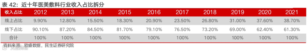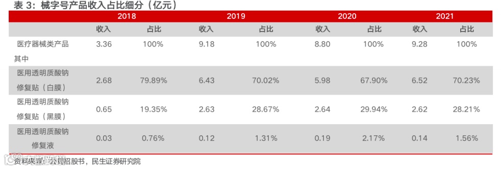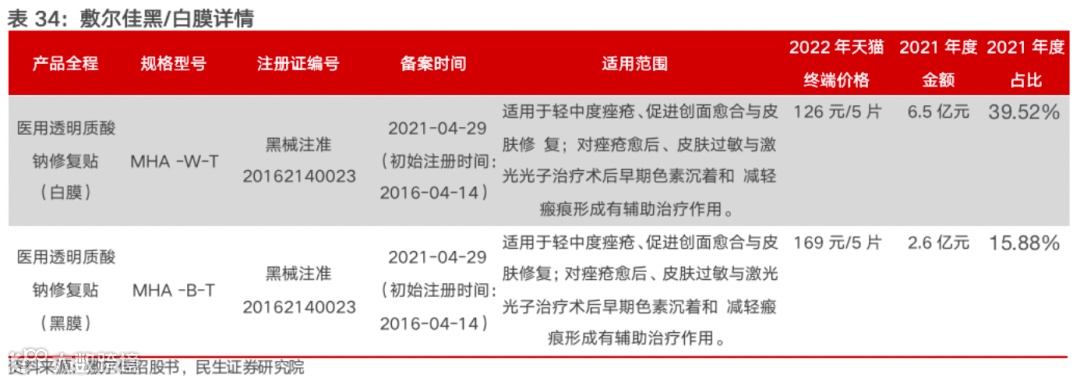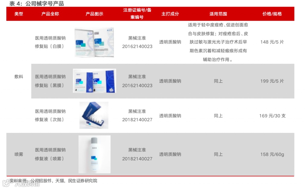 1)械字号产品共计4款SKU,白膜和黑膜为公司核心产品。公司目前在售医疗器械类产品主要分为敷料、次抛及喷雾三种类型,共计两项医疗器械注册备案,产品主打成分均为透明质酸。公司核心大单品为白膜和黑膜,2021年贡献医疗器械类收入分别为70%和28%。其中,白膜多用于日常肌肤护理,舒缓护肤使用不当、日晒、环境污染等引起的肌肤问题;黑膜则适用于光电美容仪器和水光针等医美术后修复。