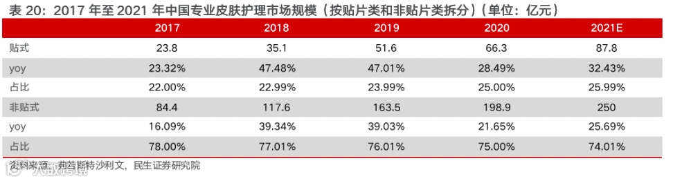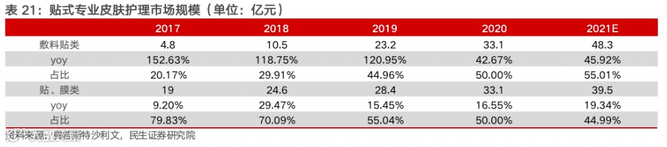 贴式专业皮肤护理市场还可分为敷料贴以及贴、膜类,其中敷料贴表现优异。敷料贴类主要为医疗器械类敷料贴,其市场规模从2017年的4.8亿元增长至2021年的48.3亿元,CAGR为78.11%;贴、膜类主要为妆字号的产品,其市场规模从2017年的19亿元增长至2021年的39.5亿元,CAGR为20%。