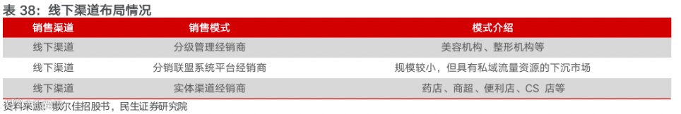 线下主要采用多层级、多维度经销布局,实现线下渠道的深度布局。公司根据不同场景对线下经销商分为三大类进行管理:1)分级管理经销商,采用分级管理模式,根据经销商能力将经销商分为甲、乙、丙三类,主要面向美容机构、整形机构等终端渠道,经营主体为企业或自然人;2)分销联盟系统平台经销商,采用官方微信公众号中分销联盟平台管理,主要助力于公司产品的下沉、深度扩展市场,经销商主要经营主体为自然人,仅可经销公司部分产品,且设立随机配额制度,避免与分级经销商之间产生压价、窜货、抢客等竞争;3)实体渠道经销商,开设直营店、加盟店,入驻各大商业综合体,同时与药店、商超、便利店等终端达成供货合作关系。在增加公司利润的同时,扩大公司产品销售覆盖面和宣传面,从而增大销售规模,提高销售收入。