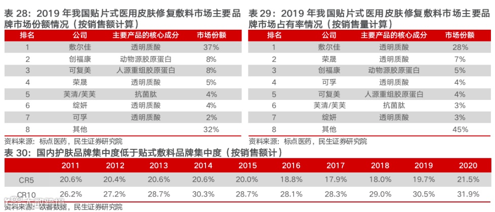 贴片式医用皮肤修复敷料市场呈现高集中度。在械字号备案的严格监管政策提高了行业进入门槛,同时较强的用户粘性使品牌头部效应加剧下,2019年敷尔佳、创福康、可复美、荣晟等品牌共同占据贴式敷料市场近7成份额,其集中度远高于护肤品行业集中度(2019年护肤品行业品牌集中度CR10仅30.5%)。