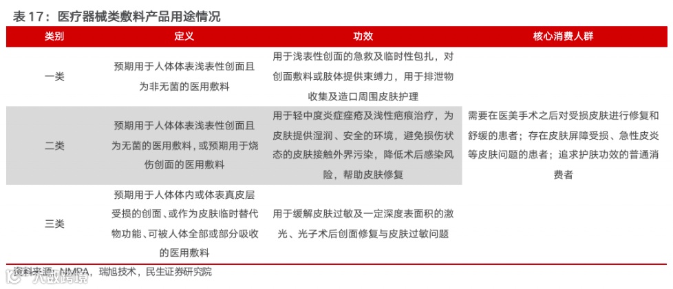医疗器械类敷料可以与创面直接或间接接触,具有清洁覆盖创面、吸收体内渗出液、为创面提供愈合环境、支撑器官或组织等医疗作用。医用敷料主要分为外科敷料(分为可吸收和不可吸收敷料)、接触性创面敷料(分为急性创面敷料和慢性创面敷料)、包扎固定敷料、造口疤痕护理用品等。根据《医疗器械监督管理条例》规定,医疗器械类敷料产品根据风险程度由低到高,依次按第一类、第二类、第三类医疗器械分类管理,作皮肤护理用途的主要为二、三类敷料。目前针对三类人群使用,一类是术后需要对受损皮肤进行修复的医美消费人群;另一类是存在皮肤屏障受损、皮炎痤疮等皮肤问题的患者,医用敷料起辅助修复、冷敷舒缓的作用;此外,追求功效性护肤的消费者也会选择医用敷料。