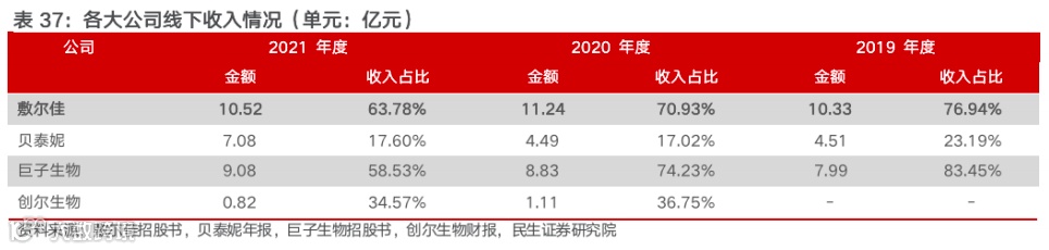 产品、渠道、营销多维度强化竞争力,持续强化品牌知名度和铸造企业龙头地位。(1)大单品打造品牌力,产品矩阵持续丰富。敷尔佳旗下核心单品为白膜和黑膜,两大单品推动公司医疗器械类业务市场地位持续提升,2020 年在敷尔佳在医疗器械贴类敷料产品中市占率第一达25%。此外公司持续强化产品矩阵搭建,在强品牌力驱动下,多样化产品呈现持续放量。(2)线下深度布局,线上多平台打通。公司高度重视线下布局,通过买断经销、联盟经销、渠道经销三种模式,已经实现覆盖医疗机构、美容机构、化妆品专营店等多层级、多维度的终端销售格局。线上通过直销、经销等多样化方式落实到终端消费场景,天猫、小红书、考拉海购、京东、抖音、快手、拼多多等 B2C 平台均有设立官方自营旗舰店,实现线上销售平台的全覆盖。(3)多维度精准营销布局,保持强品牌力。公司从传统媒体、新媒体、移动端、公众号到小程序等多层次推广矩阵,实现从广度到精度的品牌推广,精准营销下,高效提升品牌知名度,且销售费率远低于可比公司。