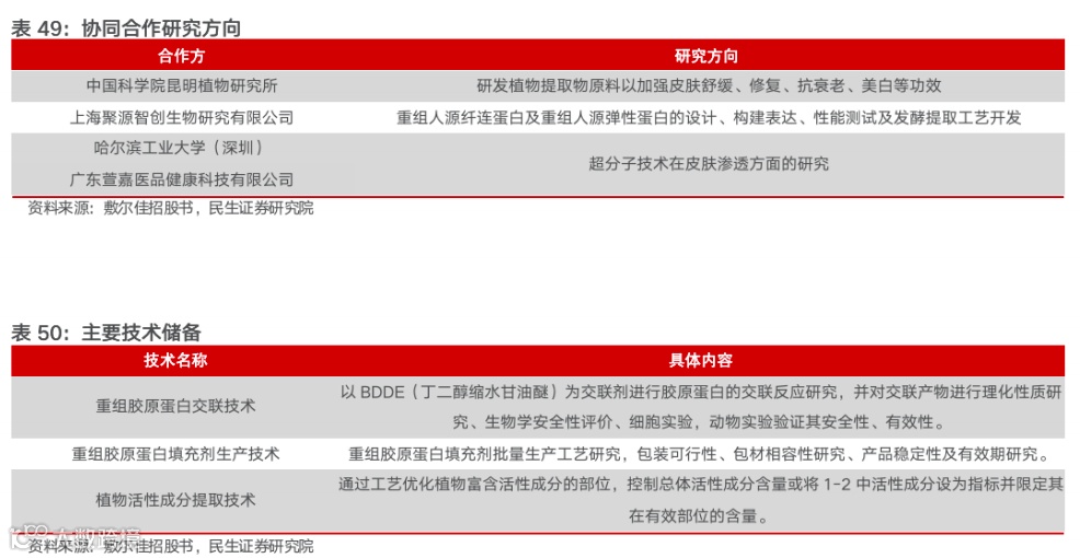 通过独家合作原料、专利配方、基础研究等路径,向上寻求突破,丰富技术储备,以满足消费者的多样化需求。2021年公司进行研发及质量检测中心建设项目,同步推进技术研发和质量检测,研究专业皮肤护理产品,以提高研发能力、产品丰富度、技术储备和竞争力;公司大力引进研发人才,研发人员数量由2019年的3人、2020年的4人增长至2021年的6人;敷尔佳加深与科研院所的合作,搭建研学产业链条。此外在技术储备方面,公司布局重组胶原蛋白相关技术,包括有重组胶原蛋白交联技术、重组胶原蛋白填充剂生产技术等,为持续上行的胶原蛋白产品消费需求做储备。