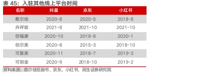 产业链一体化布局,多维度强化竞争力,未来增长可期。(1)延伸至前端,加固研发实力。敷尔佳完成产业链的垂直整合,通过自产模式把控产品质量、夯实研发基础;同时通过独家合作原料、专利配方、基础研究等路径,向上寻求突破,丰富技术储备,以满足消费者的多样化需求;(2)多平台齐发力,持续提升品牌力。敷尔佳通过多层次、多维度、多元化的宣传推广矩阵,持续升级品牌影响力;在品牌力提升下,多渠道齐发力,线上布局拉动更长远发展。(3)募集资金助力产+研+宣多维强化。敷尔佳募集资金计划投放在生产基地建设项目、研发及质量检测中心建设项目和品牌营销推广项目,形成生产、研发、宣传多维强化的战略布局,进一步夯实公司核心竞争力。