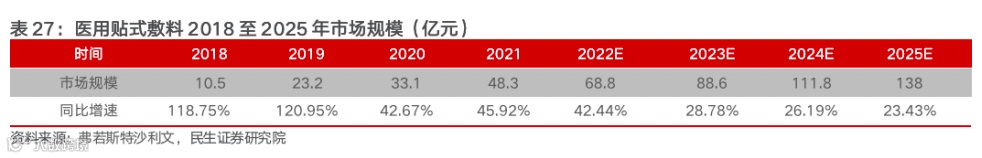 市场空间规模测算之二:在消费人群渗透率提升、消费频次增长、均价上行驱动下,据弗若斯特沙利文数据,医疗器械类贴式敷料的市场规模有望从2019年的23.2亿元增长至2025年的138亿元,CAGR达到34.6%。